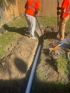 Excavating a trench and placing the antimicrobial GrateDrain™ tile with a stone filter bed to promote clean, consistent water flow.