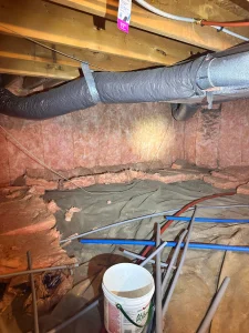 During the initial inspection, our team found several common issues contributing to poor indoor air quality and moisture concerns. The existing vapor barrier in the crawl space was deteriorating, allowing ground moisture to rise and circulate throughout the home. Additionally, fiberglass insulation had started to sag and collect condensation, making it less effective and increasing the potential for mold growth. The homeowner’s goal was clear: reduce humidity, improve air quality, and create a long-term solution for energy efficiency.